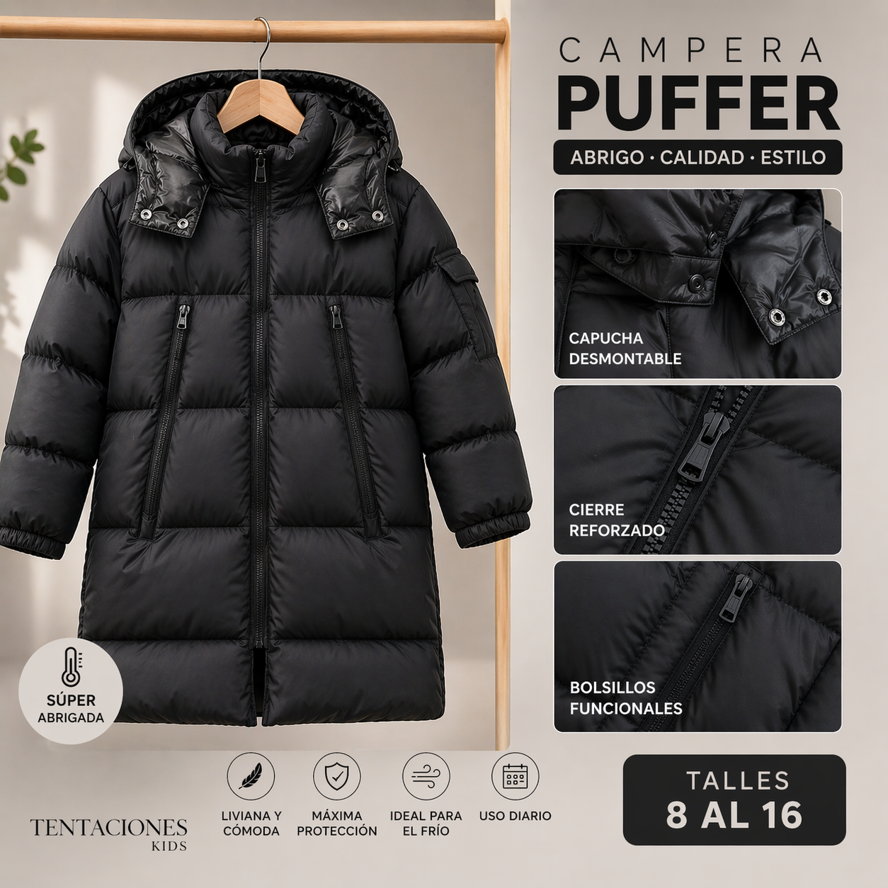 Descubre la campera puffer con capucha desmontable, diseñada para ofrecerte la máxima protección contra el frío. Su diseño liviano y cómodo la convierte en la opción ideal para mantenerte abrigado durante los días más fríos.
