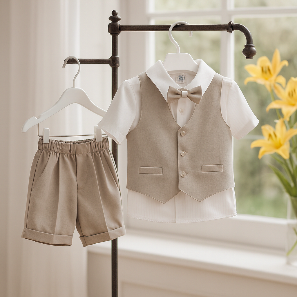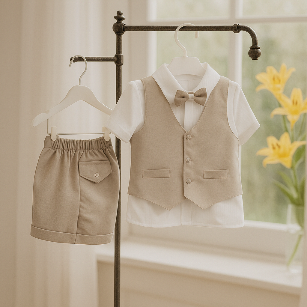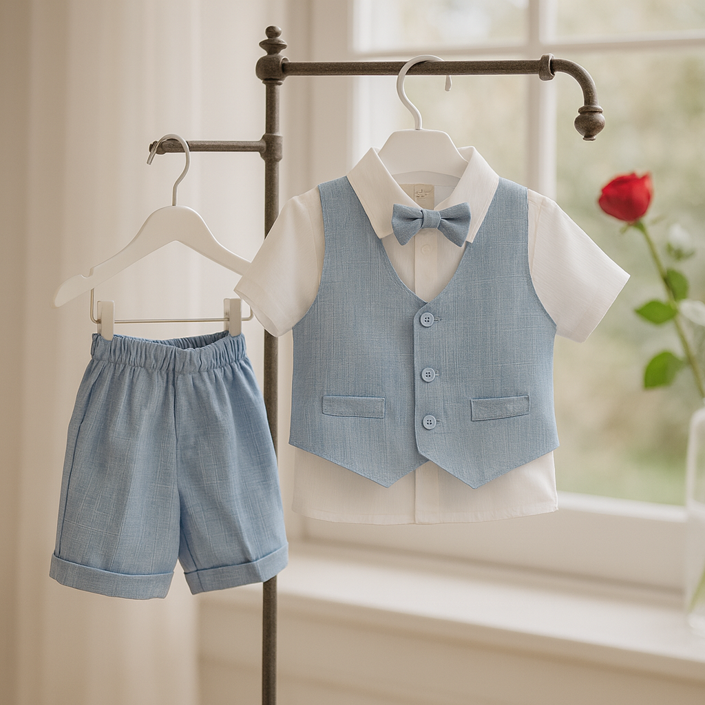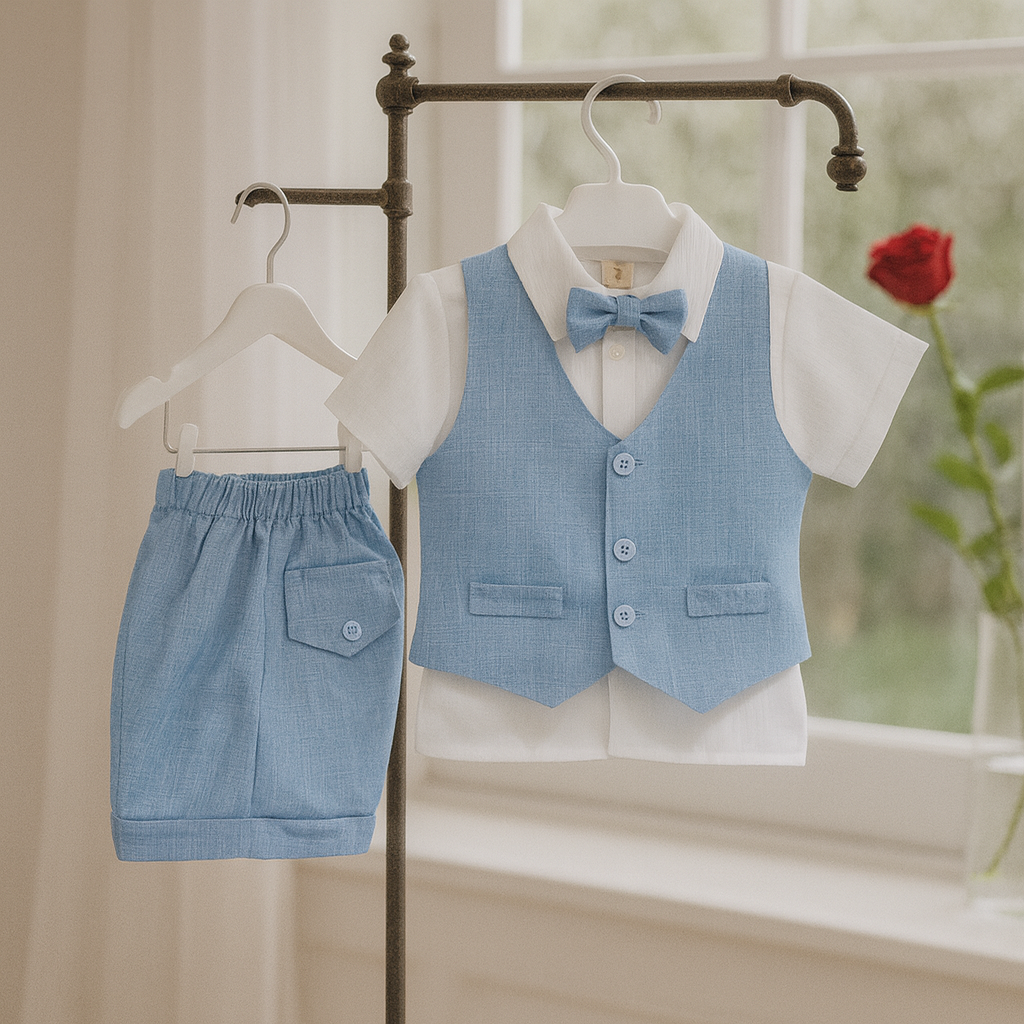 El conjunto está confeccionado en materiales ligeros y transpirables, ideales para climas cálidos o eventos al aire libre. La camisa y bermuda presentan textura melange, lo que añade un toque distintivo. El color beige y celeste no solo complementa una vibra tropical, sino que también aporta versatilidad, adaptándose a diferentes ocasiones como bodas, reuniones informales o cenas al anochecer.