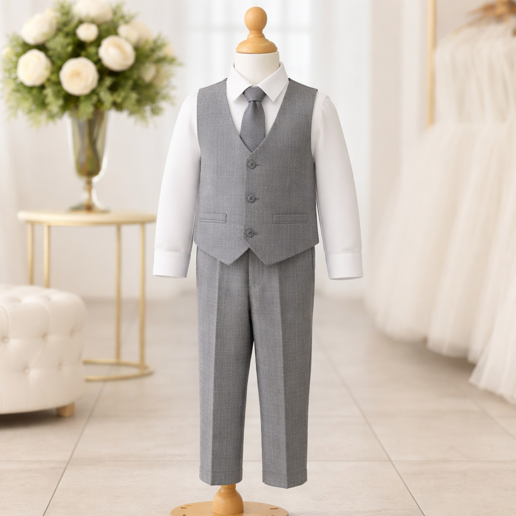 Presentamos este impresionante conjunto compuesto por chaleco, camisa, corbatín y pantalón confeccionados en tela mecánica color azul o beige. Su diseño único y refinado lo convierte en la opción ideal para cualquier evento destacado, desde elegantes bodas, hasta reuniones formales y celebraciones especiales. Con este conjunto, lograrás destacar con estilo y confianza en cada ocasión.
