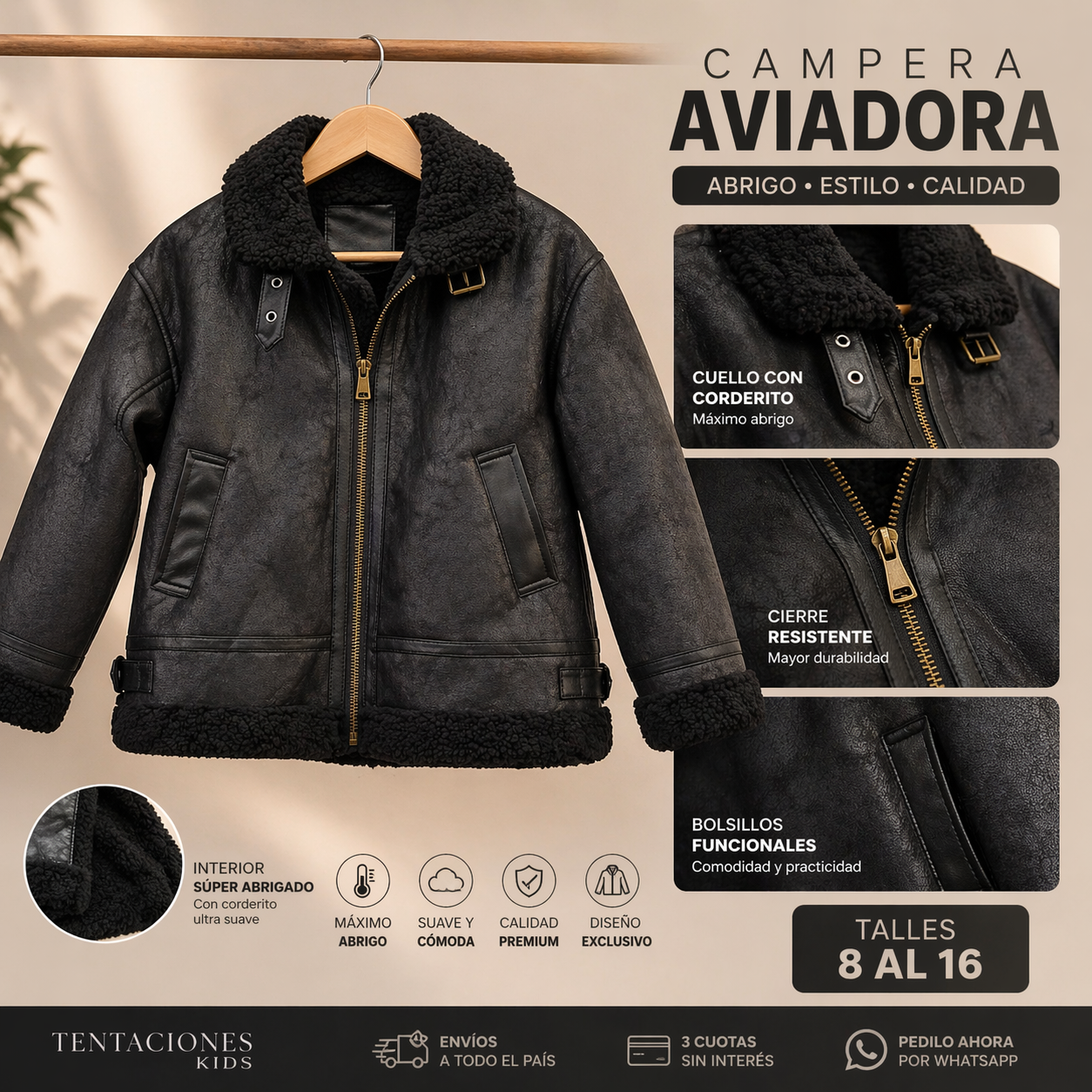 Fabricado con cuero premium y forro de corderito, este producto combina suavidad y resistencia. Los cierres duraderos aseguran mayor practicidad y prolongan la vida útil de tu nuevo abrigo favorito.
